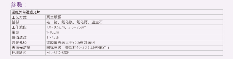 我司生產(chǎn)的遠(yuǎn)紅外帶通濾光片中性波長一般在2.0μm~25μm范圍內(nèi),采用硅、鍺、藍(lán)寶石、氟化鎂、氟化鈣為基材鍍膜。濾光片峰值可達(dá)75%以上。