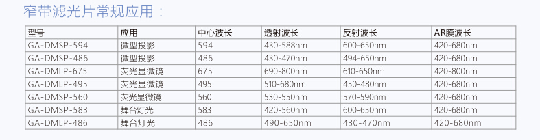指45度入射或大角度入射時,把光源分離出特定的光譜改變部分光譜光路方向,常用于酶標(biāo)儀器、熒光顯微鏡系統(tǒng)、投影光引擎系統(tǒng)、激光燈、光學(xué)儀器分束、視頻眼鏡等傳感器系統(tǒng)。是光學(xué)設(shè)計者狂熱追求的光學(xué)元件。能有效縮小器件的結(jié)構(gòu)實現(xiàn)多功能的光路。
