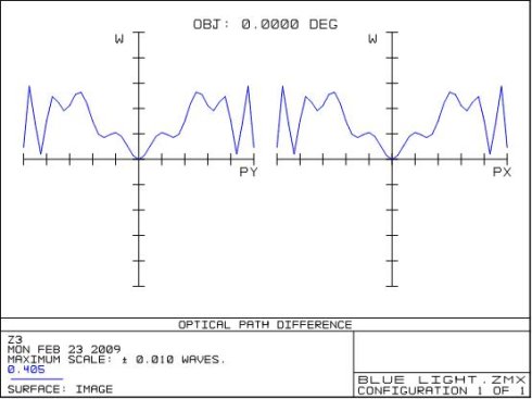 一、性能指標(biāo) 光學(xué)總長:4.07mm NA:0.8 入瞳直徑:4mm 結(jié)構(gòu):1G1P OPD:<0.01waves