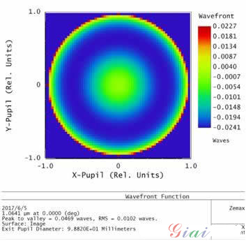 后來經(jīng)過繼續(xù)調(diào)節(jié)參數(shù)和優(yōu)化函數(shù),最后達(dá)到了要求。但是系統(tǒng)的長度較長,且由于個(gè)別鏡片的彎曲較大,使用彎月鏡來平衡系統(tǒng)的像差。彎月鏡的加工難度是比較大的,增加了生產(chǎn)成本。